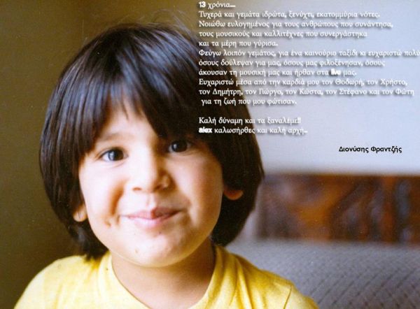 Η παιδική φωτογραφία του Διονύση Φραντζή, του πρώην μπασίστα των Onirama, μαζί με το αποχαιρετιστήριο μήνυμά του, όπως αναρτήθηκε στο επίσημο facebook page του συγκροτήματος.