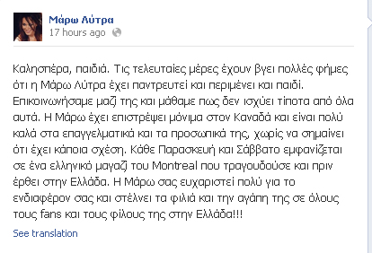 Οι άνθρωποι που διαχειρίζονται τη συγκεκριμένη σελίδα ανάρτησαν το παρακάτω μήνυμα: "Καλησπέρα, παιδιά. Τις τελευταίες μέρες έχουν βγει πολλές φήμες ότι η Μάρω Λύτρα έχει παντρευτεί και περιμένει και παιδί. Επικοινωνήσαμε μαζί της και μάθαμε πως δεν ισχύει τίποτα από όλα αυτά. Η Μάρω έχει επιστρέψει μόνιμα στον Καναδά και είναι πολύ καλά στα επαγγελματικά και τα προσωπικά της, χωρίς να σημαίνει ότι έχει κάποια σχέση. Κάθε Παρασκευή και Σάββατο εμφανίζεται σε ένα ελληνικό μαγαζί του Montreal που τραγουδούσε και πριν έρθει στην Ελλάδα. Η Μάρω σας ευχαριστεί πολύ για το ενδιαφέρον σας και στέλνει τα φιλιά και την αγάπη της σε όλους τους fans και τους φίλους της στην Ελλάδα!!!
